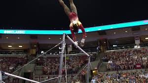 She held on to the bar this time and posted a score of 14.85, which through three rotations was the highest score on that event.