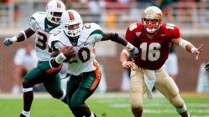 After redshirting in the 1997 season, Reed led the team with two interceptions and four forced fumbles in the 1998 season. He had two more interceptions in the 1999 season. Reed was recognized as a consensus first-team All-American in the 2000 season, and a unanimous first-team All-American in the 2001 season. In 2001, he led the nation with nine interceptions for 209 yards, which was a school record, and three touchdowns. He helped seal a memorable win over Boston College in 2001 when he grabbed the ball out of teammate Matt Walters’s hands, who had just intercepted it, and raced 80 yards for a touchdown. Reed was honored as the Big East Defensive Player of the Year in 2001, and was named National Defensive Player of the Year by Football News. He was a finalist for the Jim Thorpe Award and was a semifinalists for the Bronko Nagurski Trophy.