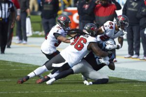 Tampa Bay Buccaneers defensive lineman Steve McLendon (96) helps bring down Carolina Panthers running back Mike Davis during an NFL game on Nov. 15, 2020, at Bank of America Stadium in Charlotte.